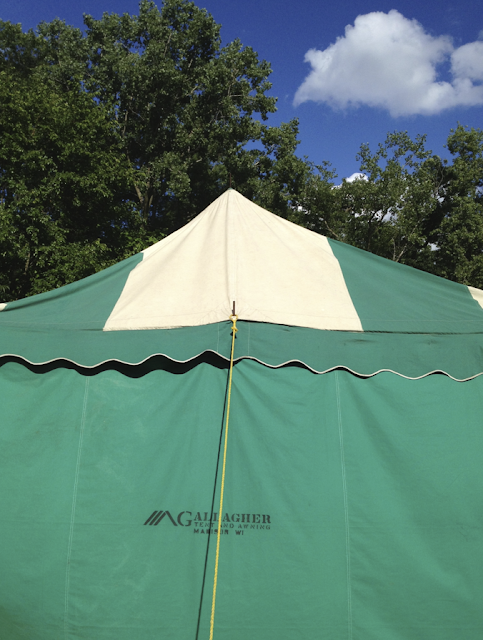 They make the awnings for the Walworth County Fair and flea market- gorgeous, vintage, hand-sewn canvas candy striped tents with perfect little scalloped edges with white trim, and hand-stenciled logos… So when I finally got in touch with the great grandson, I was thrilled to hear that they had a vintage tent in stock and would hook me up with one. She now sits in our field. 3 hours and 2 guys to install!
