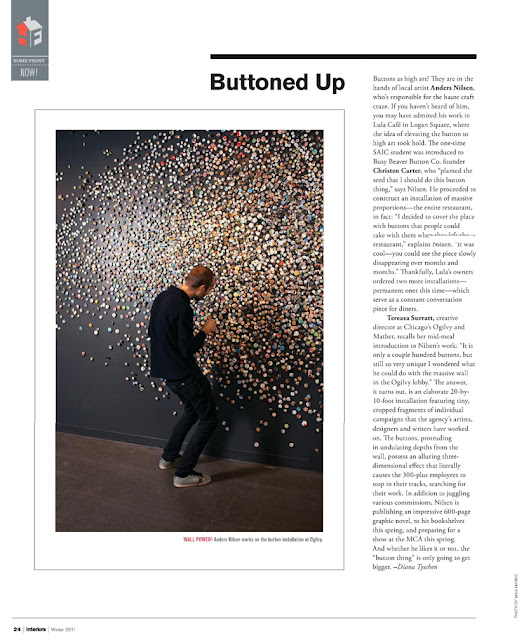 we needed a facelift at ogilvy, so i called in anders nilsen (the artist who did an button installation @ lula cafe in logan square) i asked him if he could take one of his 500 count button count and do it on a bigger scale. 20 feet, 10,000 buttons. we collaborated to come up with the installation you see here- featuring the segments of Ogilvy’s work dating back to the 1950’s, and mixing in pop culture spanning the last several decades. the buttons are in multiple sizes, and installed to undulate off the wall at different depths. he has a show @ the MCA this month. check him out in all of his awesomeness. andersbrekhusnilsen.com