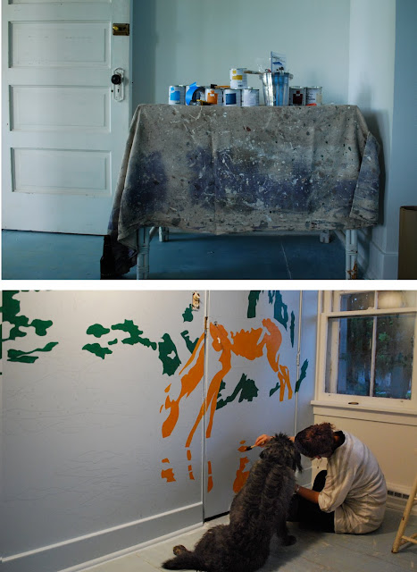 find an old school paint by number painting on ebay, customize it to fit the wall size you’re painting (in my case, nursery wall). break down the colors by hand numbering, matching each to a pantone chip to assign the palette. take your pms colors to the paint store. now shoot a pic your P.B.N. painting guide, download it, project it on your wall- trace it out, then start filling in your numbers. (used foam brushes & latex paint)