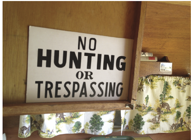 * mini library of wisconsin stuff: no hunting sigage. high life coasters. wild game books. pheasant serving trays.