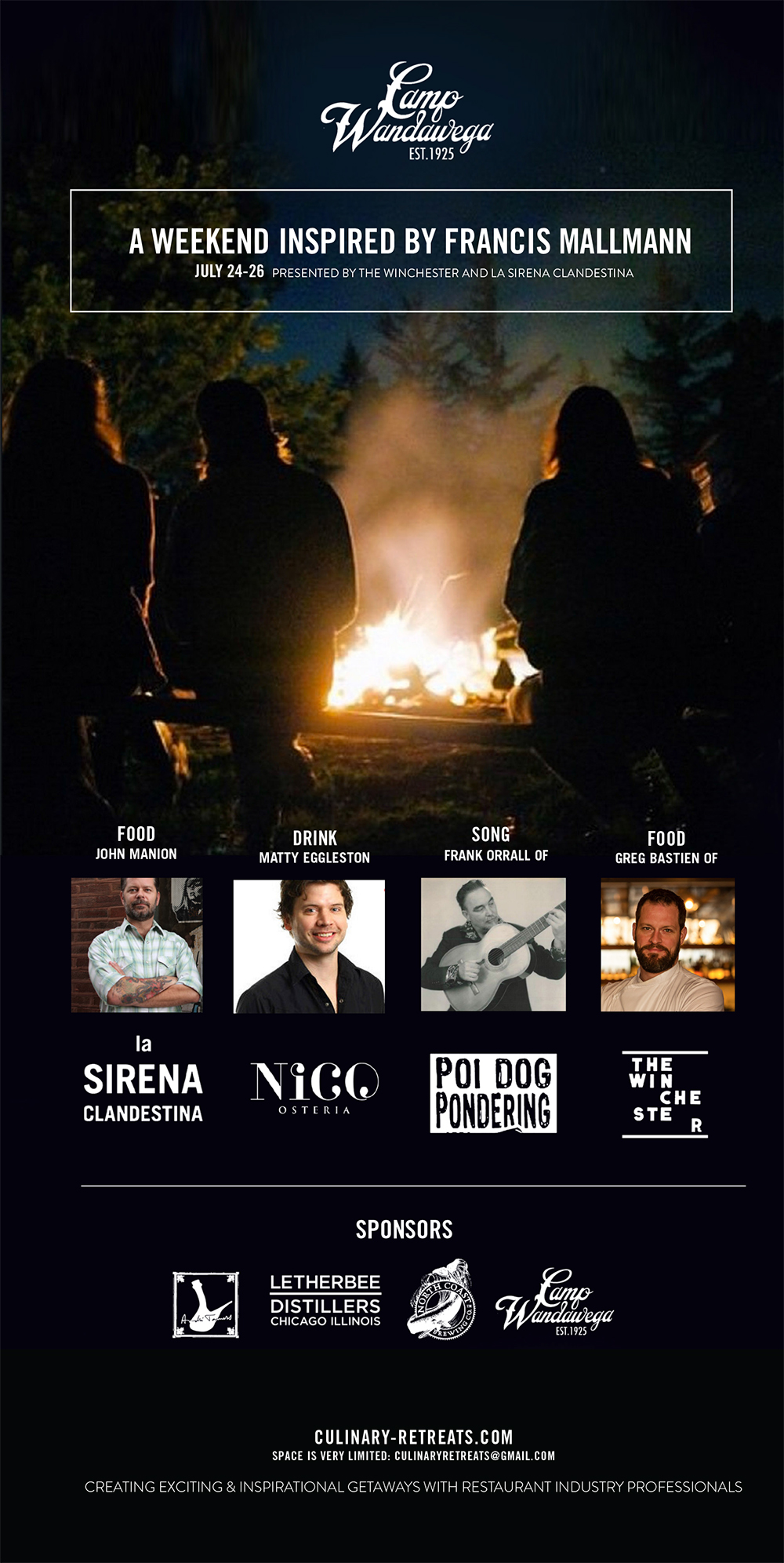This July 24-26 some of Chicago’s culinary, cocktail rockstars align at Camp Wandawega. Under the stars, and serenaded by Frank Orrall of Poi Dog Pondering.